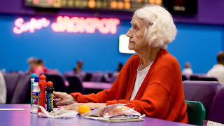 Jackpot, a 50-minute documentary that tracks five regulars of Ontario’s Delta Bingo, is sweet, funny, melancholic, and nostalgic. Bingo halls, which have a small-town, vintage aesthetic that is similar to bowling alleys, feel like a homier incarnation of a casino. This makes for a film that really pops visually, with a minimal, but bright, palette of blues, purples, yellows, pinks and neon lights. The film’s charm comes from the superb selection of subjects, all of which wallow in the simple game as a way out, whether it’s from divorce, deceased companions, or a disability. Margaret, the elderly woman in the picture above, comes to bingo six days of the week, and spends her winnings on more bingo. A moment toward the end when she is shown descending a staircase in her home while saying that she would die without bingo, is cute at first, but grows more tragic when you realize that this is absolutely true. A divorced man who spent many years crying over the absence of his ex-wive and his children found solace in his trips to the bingo hall, and even met his new partner there. Another man, whose wife passed away ten years ago, says, clearly choked up, that his wife would never come to bingo when she was here, and that he just started coming regularly after she passed. Bingo, like slot machines, is pure luck, one of the few games that really is 0% skill, lending another degree of pity to these characters who find so much pride in winning a game that they have no control over. It’s a glimpse of lowered expectations, but also of the simple things that can bring someone happiness. The film could have benefited from looking a bit at the history of bingo, and a look at supposed strategies, as well as the game’s history and development in Canada.